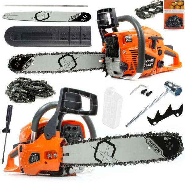 Láncfűrész DEMON 2550W RQ-65DEMON RQ-65 benzines láncfűrész egy erőteljes és hatékony eszköz, amely kertben, gyümölcsösben vagy tűzifa előkészítésénél használható. A 2,55 kW maximális teljesítményű kétütemű motorral és a könnyű indítási rendszerrel a láncfűrész egyszerűen kezelhető, még hideg motor esetén is. A tengely precíz kiegyensúlyozása, az antivibrációs rendszer és a masszív anyagok kényelmes munkavégzést és hosszú élettartamot biztosítanak. A használható vágáshossz 38 cm, a maximális fordulatszám 8 500 ford/perc. A biztonság érdekében a fűrész fékrendszerrel és gyors láncfeszítéssel van felszerelve. A készlet tartalmazza az azonnali használathoz szükséges összes tartozékot: vezetősínt, láncot, burkolatot, karbantartó szerszámokat, keverőtartályt és magyar nyelvű használati utasítást. A készlet tartalma:1x DEMON RQ-65 benzines láncfűrész1x DEMON vezetősín1x vágólánc1x vezetősín burkolat1x T-hornyos kulcs1x csavarhúzó1x imbuszkulcs1x reszelő1x keverőtartály1x gyártói eredeti csomagolásMagyar nyelvű használati utasításMűszaki adatok:Motor térfogata: 65 cm3Motor maximális teljesítménye: 2,55 kWÜzemanyagtartály térfogata: 550 mlOlajtartály térfogata: 260 mlHasználható vágáshossz: 38 cmTömeg vezetősín nélkül: 6,6 kgTömeg vezetősínnel: 7 kgFogaskerék: 7T/0,325Ajánlott lánctípus: 21BP/21VBLáncvezető horony szélessége: 1,5 mmAjánlott élezőreszelő átmérője: 4,76 mmAlapjárati fordulatszám: 2 800 ford/percMaximális fordulatszám: 8 500 ford/percZajszint: 105/109 dB (LwA/LpA)Rezgésszint:Első fogantyú: 10,7 m/s2Hátsó fogantyú: 10,5 m/s2