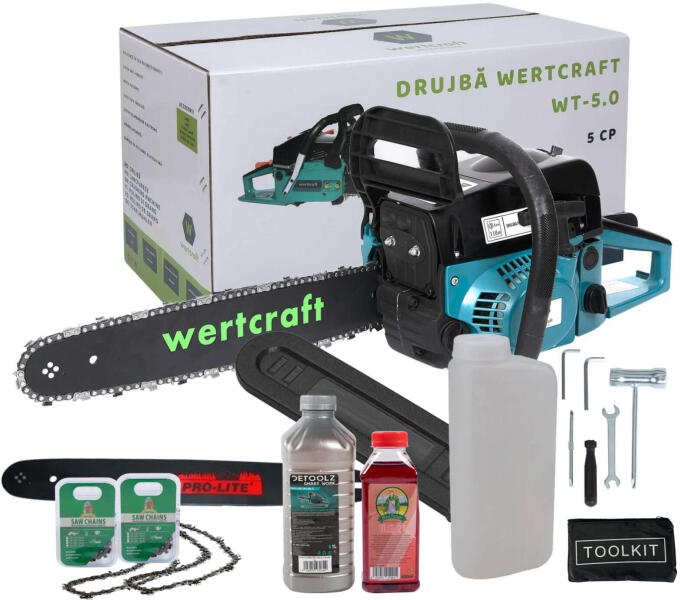 A Wertcraft WRT-5.0-5 Cp benzines láncfűrészt német technológia szerint tervezték, és kifejezetten azoknak készült, akik értékelik a láncfűrész professzionális tulajdonságait. Az évekig tartó használatnak ellenálló motor alkalmas fa tisztítására és vágására, olyan speciális technológián alapul, amely akár 50 százalékkal csökkenti a károsanyag-kibocsátást és akár 30 százalékkal az üzemanyag-fogyasztást. A láncfűrész megfelel a gyümölcsösök, erdős területek tulajdonosainak és más olyan embereknek, akik kevésbé rendszeresen vágnak. A beépített rezgéscsillapítók hatékonyan elnyelik a vibrációt, ami megkönnyíti a munkáját azáltal, hogy elkerüli a fáradtság felhalmozódását a karokban, és lehetővé teszi a hosszabb és kényelmesebb munkavégzést. A Wertcraft WRT-5.0 benzines láncfűrész előnyei:Elektronikus gyújtás;Automatikus kenés;Easy Start indító (könnyű indítás);Feltöltő szivattyú a karburátor közvetlen táplálásához;ON/OFF gomb - elektromos kapcsoló típus. Tartozékok mellékelve: 2 x Penge;Pengevédelem;2 x lánc;Csavarhúzó;Imbues;Pengefeszítő kulcs;Benzinkanna; Olaj keverék Kenőolaj